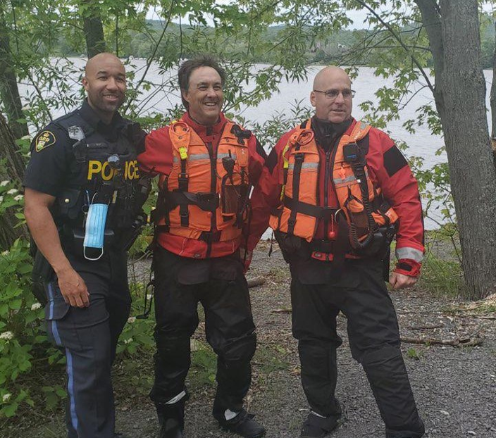 Sgt. Paul Dubé and Constable Jason Bailey from the Hawkesbury OPP detachment and Fireman Marc Gour with the Alfred-Plantagenet Township Fire Department took the fire department’s marine rescue boat out onto the river. They found the alleged « boat in distress » but received no answers to their calls to the vessel’s occupants. The boat itself continued without stopping to a marina on the Québec side of the river and docked.