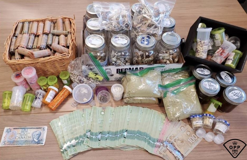 Police seized suspected methylenedioxymethamphetamine, psilocybin, LSD, morphine pills, oxycodone pills, OxyContin pills, benzodiazepine pills, ketamine, nabilone, salvia, DMT, methaqualone, CB-2, and harmaline while executing a search warrant at a Main Street East residence. In a statement, the Ontario Provincial Police said the East Region Community Street Crime Unit also seized more than $8000 in cash and other items associated with drug trafficking.