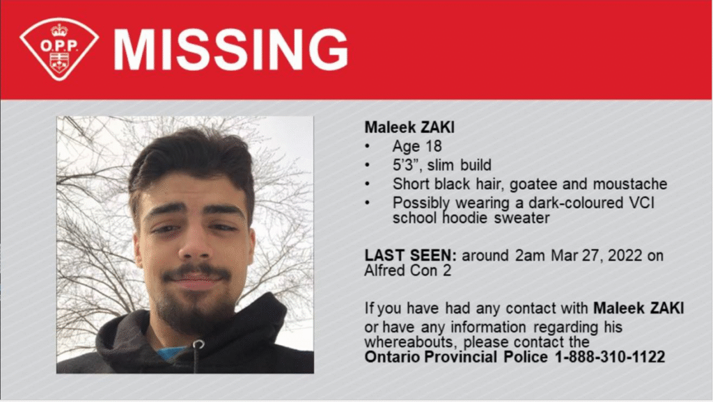 18-year-old Hawkesbury student Maleek Zaki has been found dead after attending a house party on Concession Road 2 in Alfred-Plantagenet on March 26. No other information has been released at this time, and the investigation is ongoing.