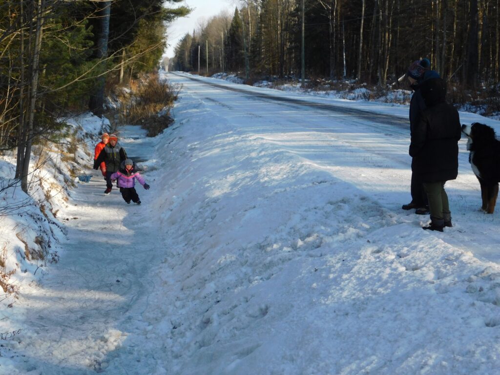 The drainage ditch running along the road past their house and their grandparents’ house nearby is nice and deep, with just enough water left at the bottom from last autumn’s rain to make a child-sized speed-skating track, with a little shovel work to clear off the snow cover.