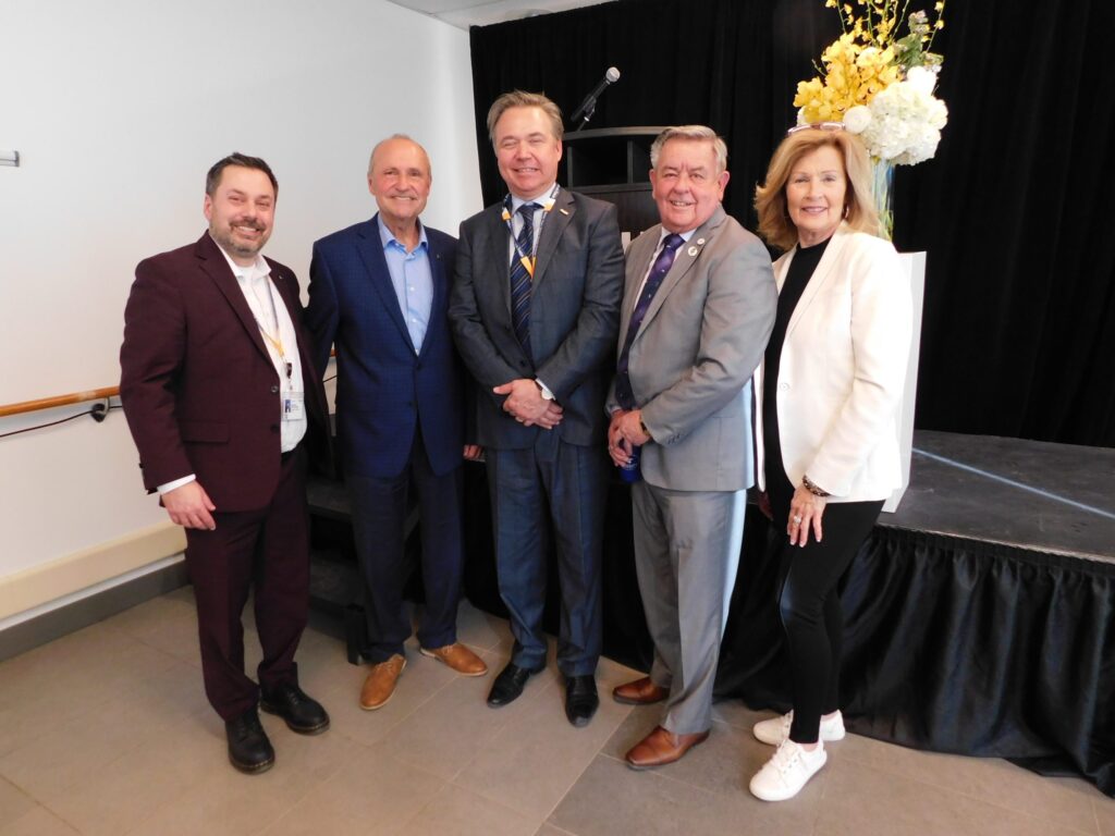 L’Hôpital général de Hawkesbury et du district (HGH) s’est doté d’un nouveau plan stratégique quinquennal pour guider ses opérations et son développement continu. Posant pour une photo après l’annonce du plan le 19 mars, (à gauche) Frédéric Beauchemin, chef de la direction de l’HGH, Guy Yelle, président du conseil d’administration, le Dr Paul E. Beaulé, chef du personnel, Yves Laviolette, préfet des Comtés unis de Prescott-Russell, et Jean Kerr, représentant des patients partenaires de l’HGH.